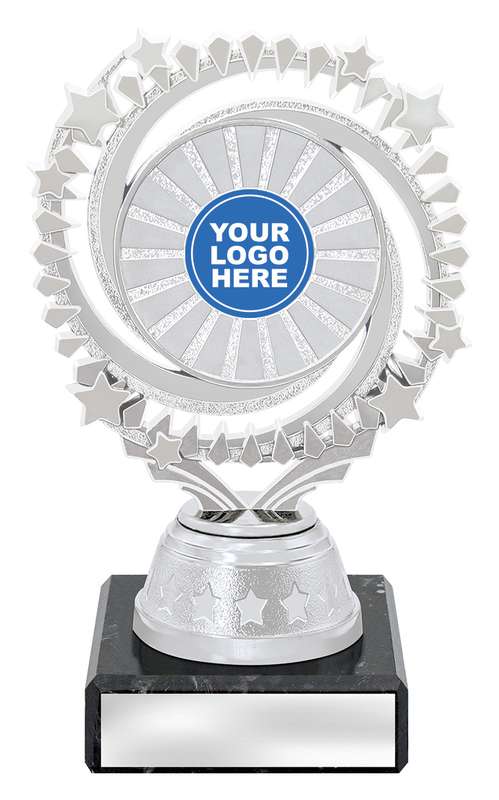 Cosmic series of affordable trophies feature star spangled holder in gold or silver – choose colour of column to suit your order. Suit 25 or 50mm centre insert.