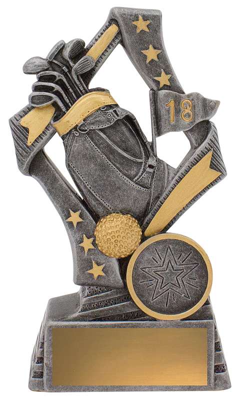 Dynamic golf trophies perfect for male and female golfers at your event. These ‘Flag’ golf trophies feature a stylish star based design with iconic golf bag and ball elements.