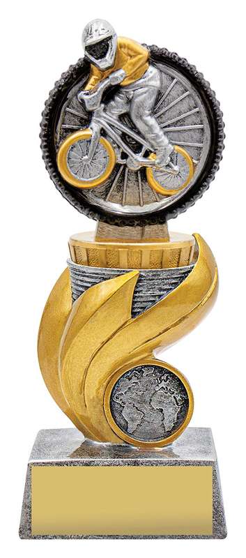 Flame trophy series is a popular and reliable choice featuring a dynamic design that celebrates your sport or activity. BMX Flame Trophy series highlights the BMX rider in action. BMX trophies available in 3 convenient sizes with the option of customisation.