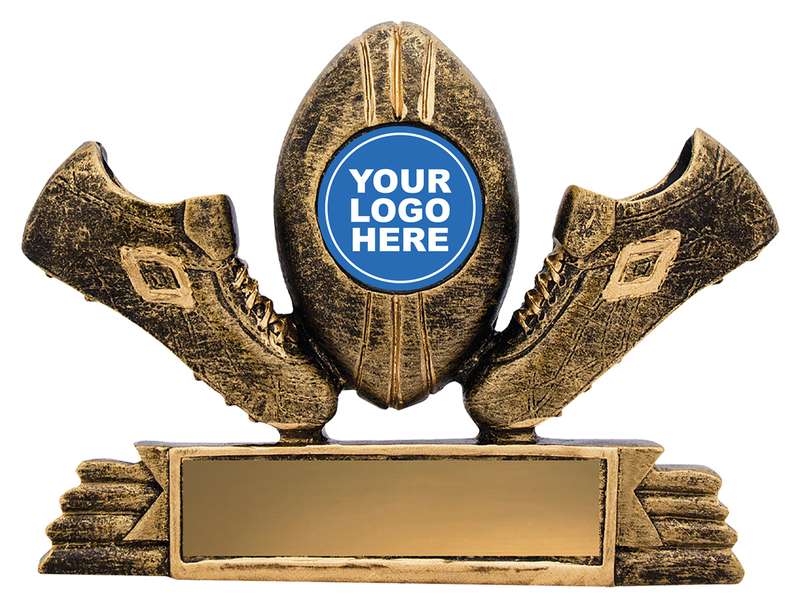 Traditional and affordable trophy item suitable for bulk orders. Iconic gold trophy with boots and ball and central space for a 25mm insert – generic theme or club logo if required