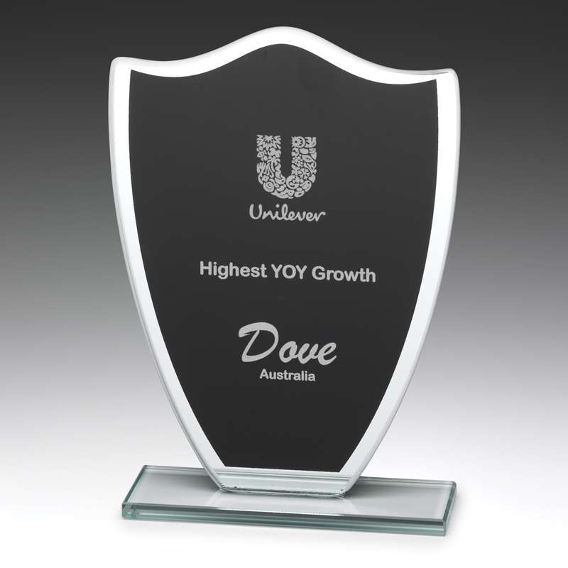 Affordable glass award – supplied in gift box – in traditional shield shape with black panel for your engraving requirements. Part of the range of budget glass awards for you to consider.