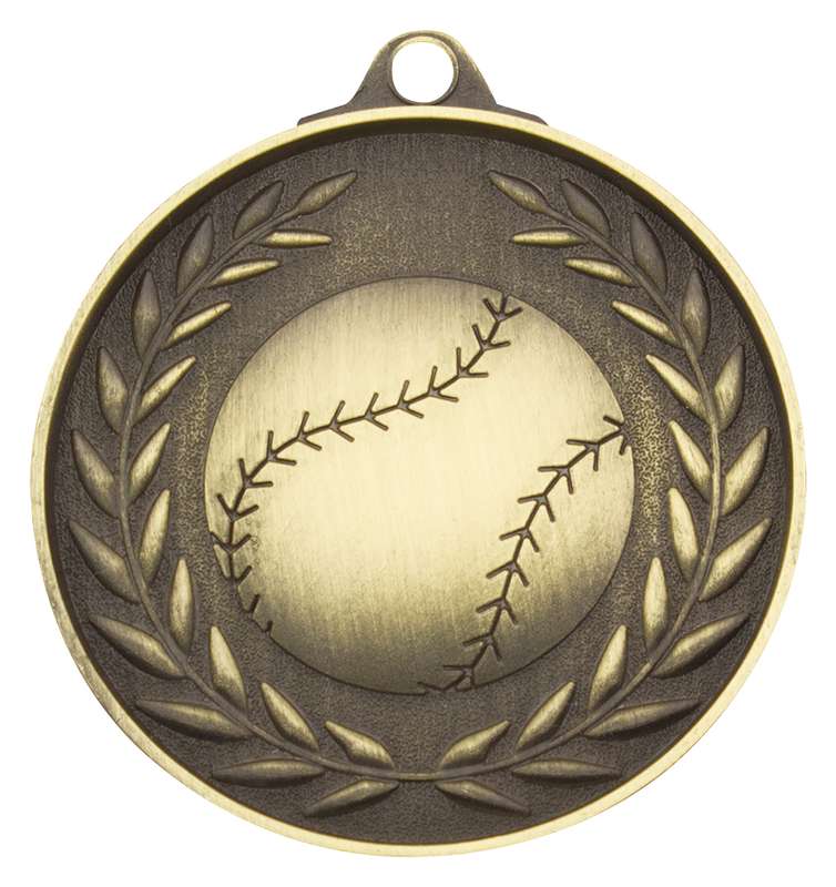 Classic wreath inspired medal for Baseball / Softball. A generic theme suitable for all players features the iconic ball and celebratory wreath representing high achievement.