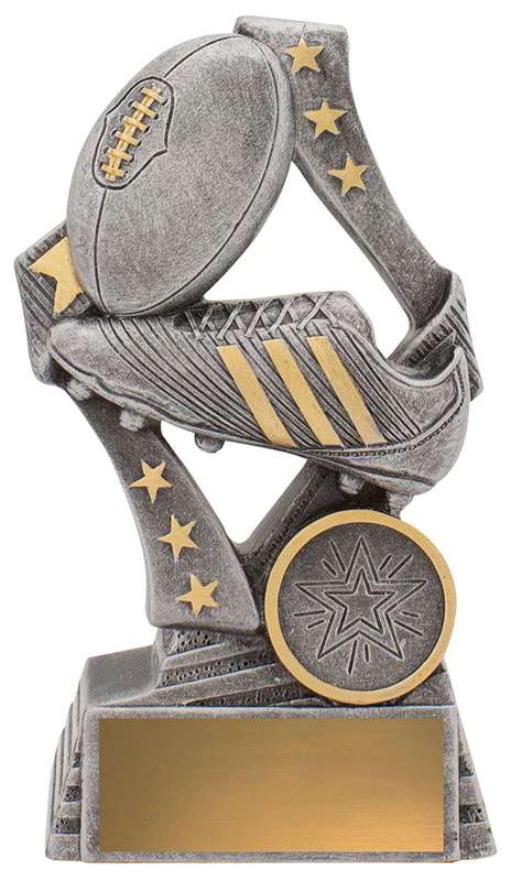 Dynamic footy trophies perfect for male and female players in your club. These ‘Flag’ aussie rules trophies feature a stylish star based design with iconic boot and ball elements.