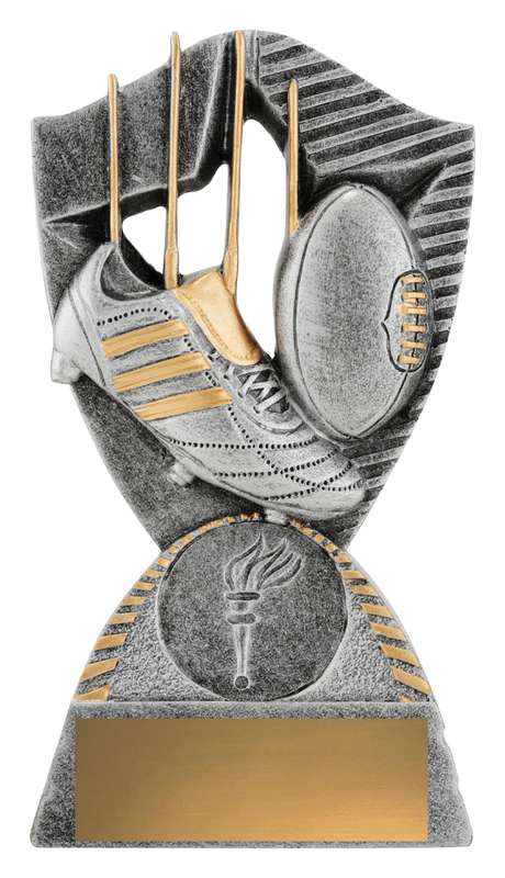 Brilliant footy trophy for your team or club. The Gambit offers a dynamic theme in antique silver & gold – space for your custom logo.