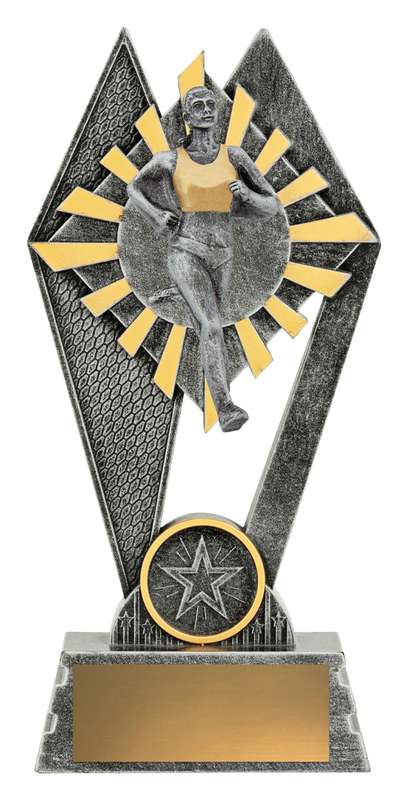 The Peak Series is an innovative trophy series offering super value for such an impressive size range. An elevated design that showcases a female runner against a vibrant sunray background.