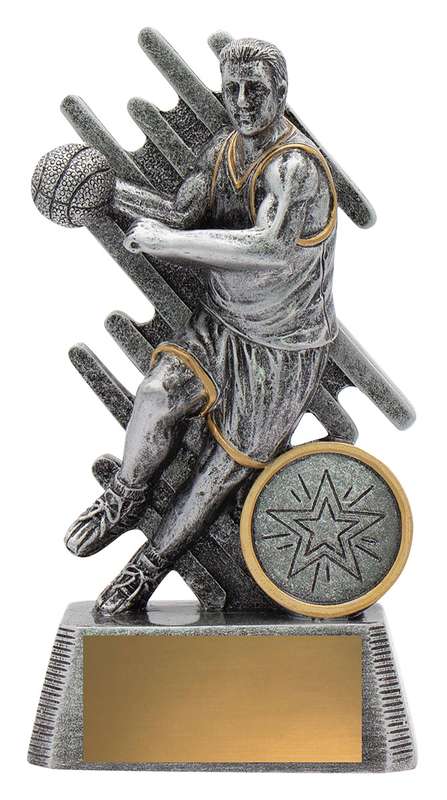 Zoom Series showcases the basketball player in action against a stylised backdrop and finished in classic antique silver. Available in multiple sizes and includes space for custom logo.